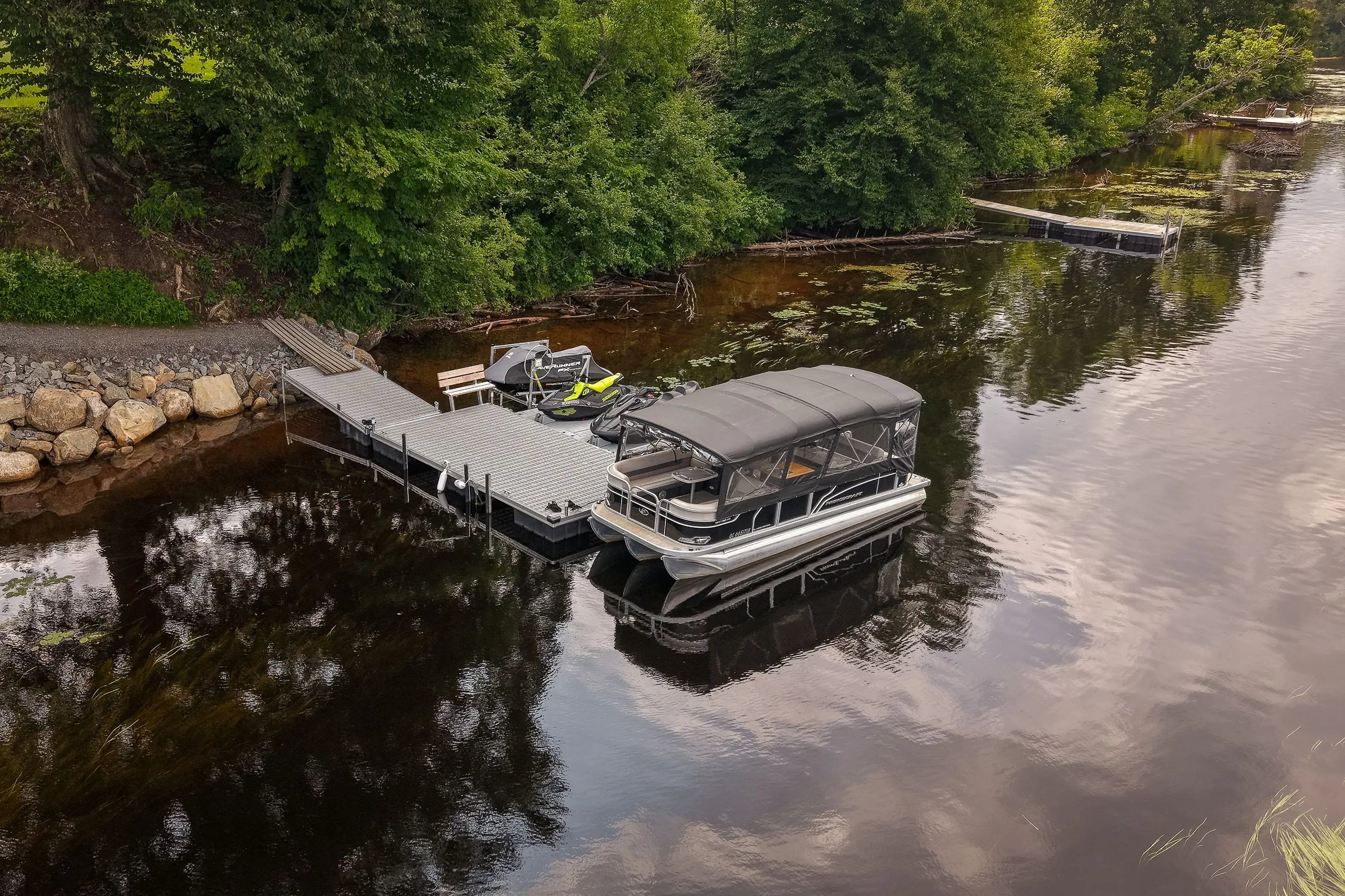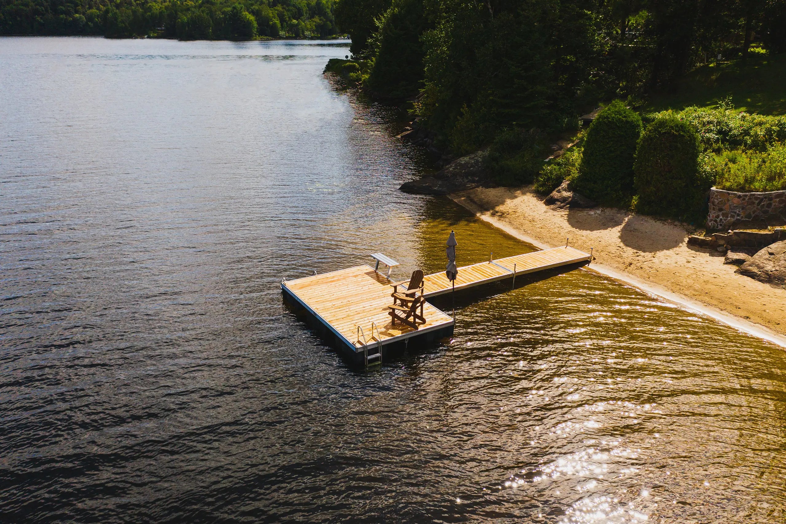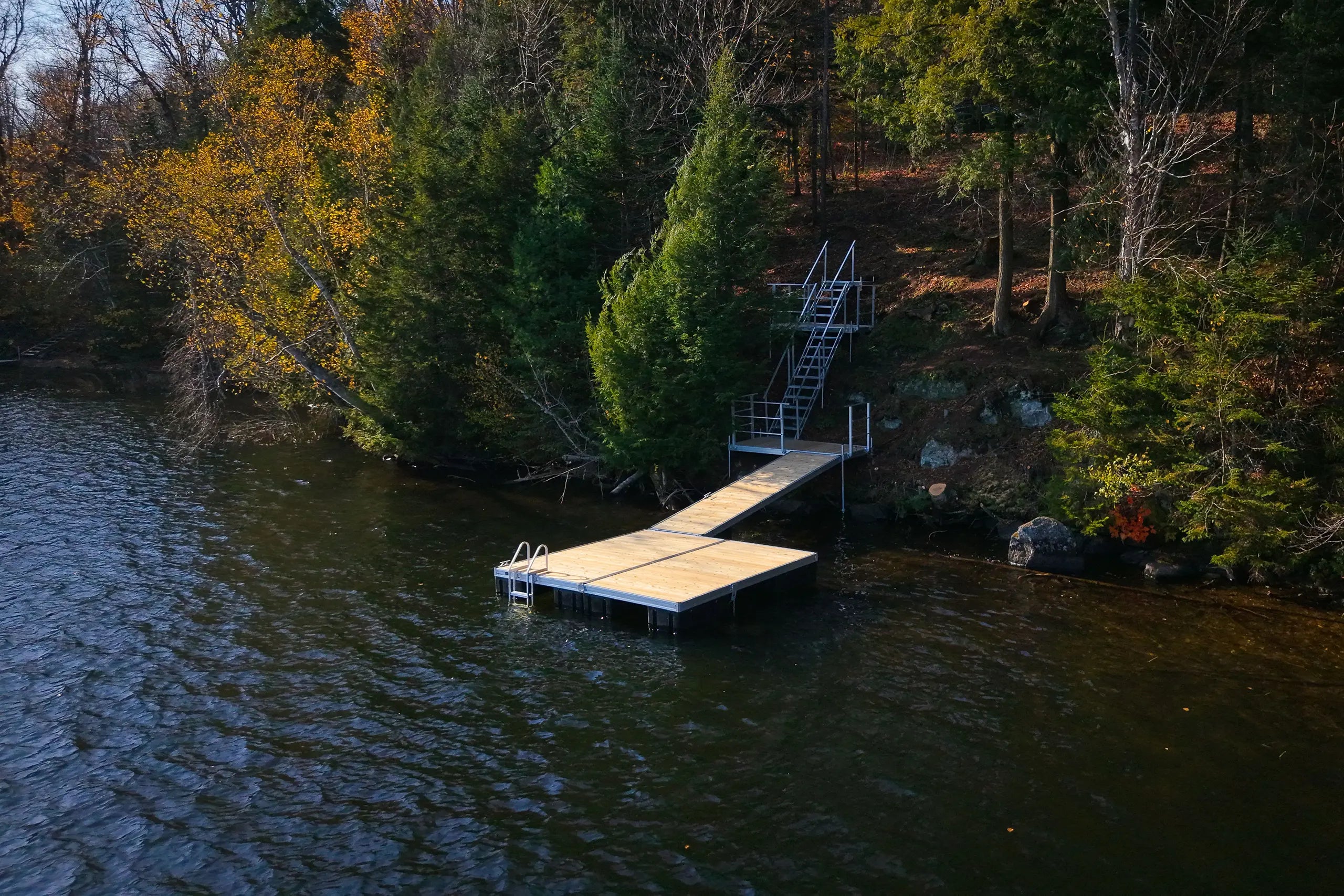 Quelle est la différence entre un quai sur poteaux et un quai flottant? Un quai sur poteaux s’installe en eau peu profonde et est soutenu par des pieux ancrés au fond de l’eau. Il doit être retiré complètement à l’automne et réinstallé au printemps.